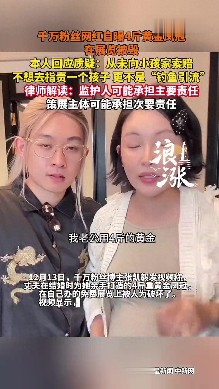 12月13日,千万粉丝网红博主张凯毅发视频称,丈夫在结婚时为她亲手打造的4斤重黄金凤冠,在自己办的免费展览上被人为破坏了。视频中,一男孩在观展时反复抱住展台柜子,并上手触碰,随后致凤冠与展罩一起掉在地上。